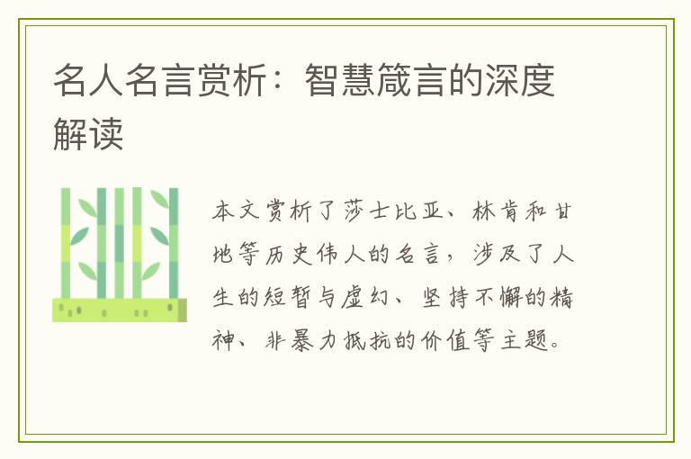 名人名言是历史的积淀,是智慧的结晶。通过赏析这些名言,我们可以领略到历史的厚重,感受到智慧的魅力。这些名言不仅仅是历史的记忆,更是我们人生的指引。让我们在人生的道路上,以这些名言为指引,不断前行,追求智慧,追求美好。